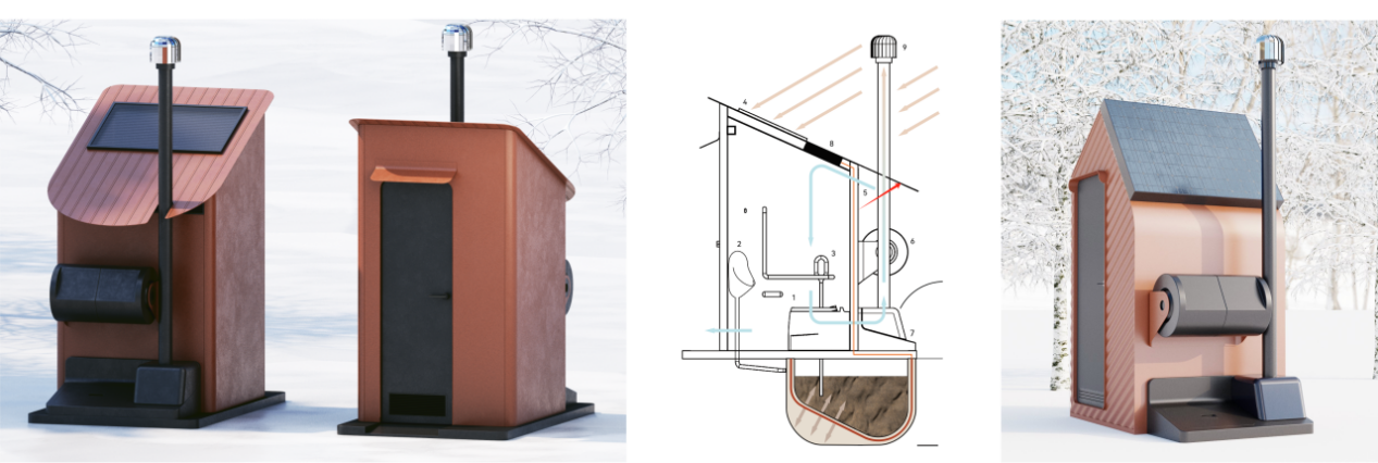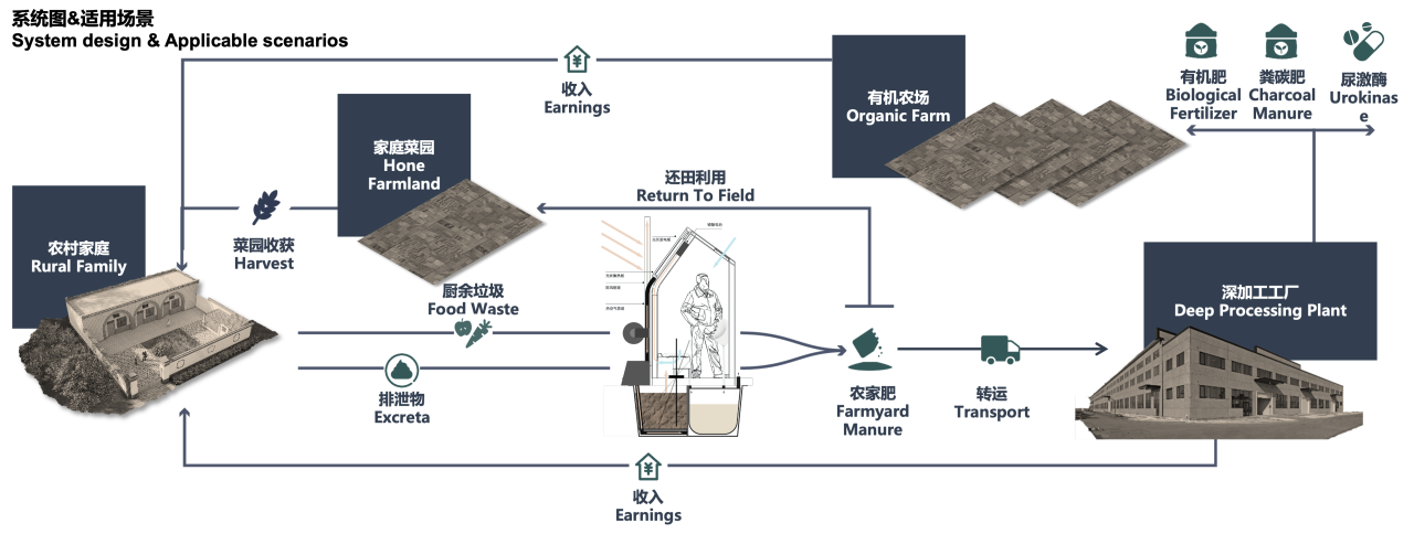 Feces are mixed with rice husk bedding containing probiotics, then composted to significantly reduce volume, stabilize texture, and eliminate odors, producing a soil conditioner. Urine is stored, matured, and diluted into organic fertilizer, with composite storage bags ensuring functionality in cold temperatures. The waterless urinal's trapezoidal back design maximizes space efficiency. Solar axial fans and passive ventilation ensure continuous odor control. A step assist facilitates use by seniors and children. High-density foam seat cushions improve winter comfort. Gravity-sealing toilet lids encourage male users to use urinal, reducing urine stains on seats and lowering humidity in the composting chamber. An optional kitchen waste processor mounted externally increases fertilizer yield. This system helps rural toilets reduce dependence on water and electricity while balancing economic, environmental, and social benefits.