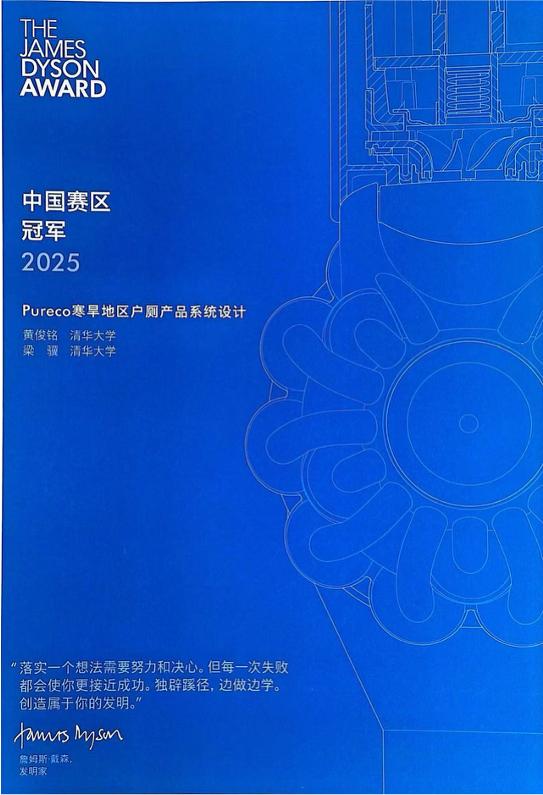 On September 12, the 2025 James Dyson Award the Chinese Mainland Regional Ceremony and 10th Anniversary Special Event concluded successfully. Huang Junming and Liang Ji from the Eco-Design Research Institute at the Academy of Arts & Design, Tsinghua University won the Chinese mainland regional title for their project “Pureco-Waterless household toilet for cold and arid areas.”
