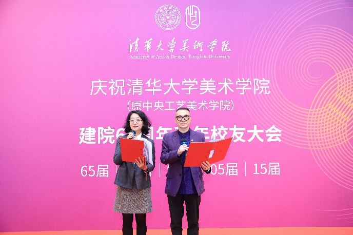 The ceremony was hosted by Wang Xiaoding (Class of 1995, 30th anniversary alumni) and He Jing (Class of 2005, 20th anniversary alumna and Assistant Professor in the Visual Communication Design Department of the Academy of Arts & Design, Tsinghua University).