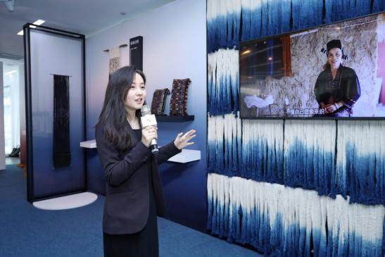 Li Jingwen explaining her design at the exhibition area, with freshly dyed threads and the scent of plant dyes in the background