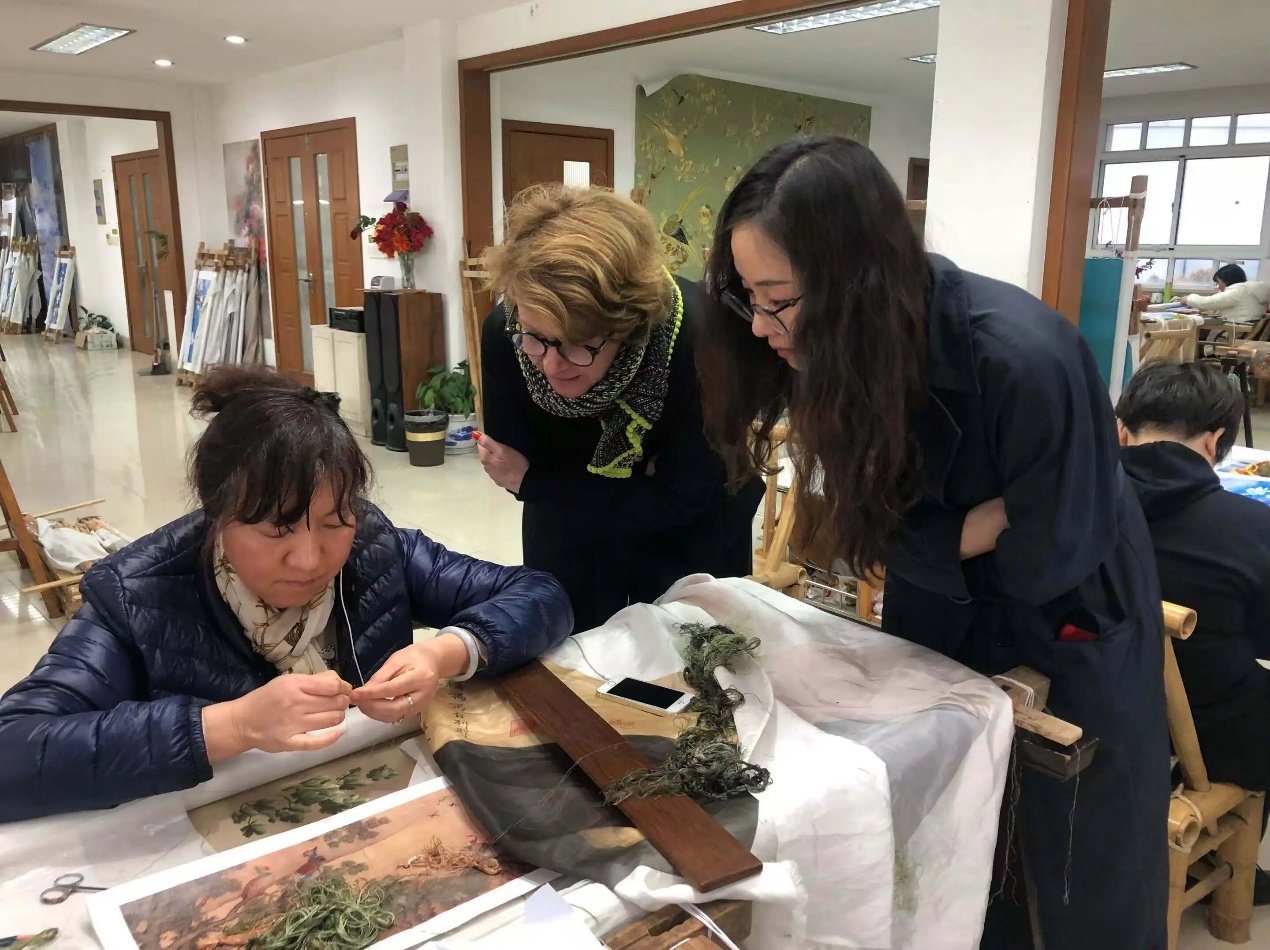 Li Jingwen (right) communicating with the embroidery ICH inheritor