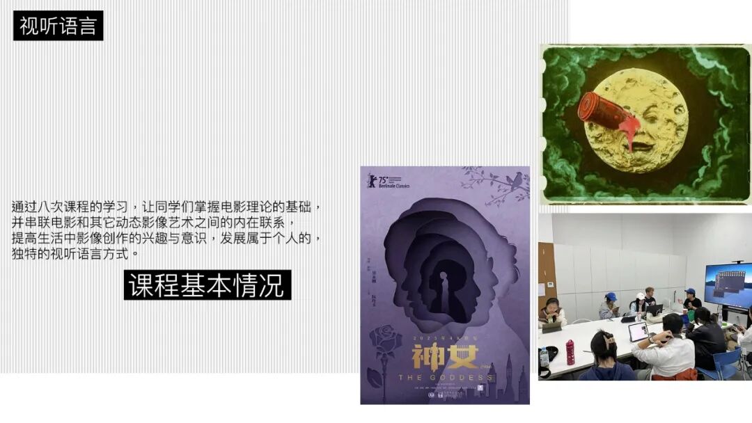Grounded in film narrative theory, this course utilizes classic film excerpts to help students learn and establish fundamental visual narrative methods, such as composition, editing, and mise-en-scène. It places particular emphasis on Eastern aesthetics in film creation, enabling students to build cultural confidence through viewing and analysis. Additionally, keeping pace with the times, the course builds upon film theory to focus on the application and innovation of audiovisual language in fields such as multimedia art and gaming. This approach helps students broaden their horizons within the complex contemporary media environment and discover their own unique artistic language.