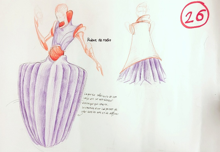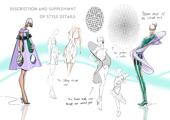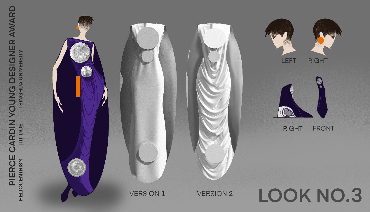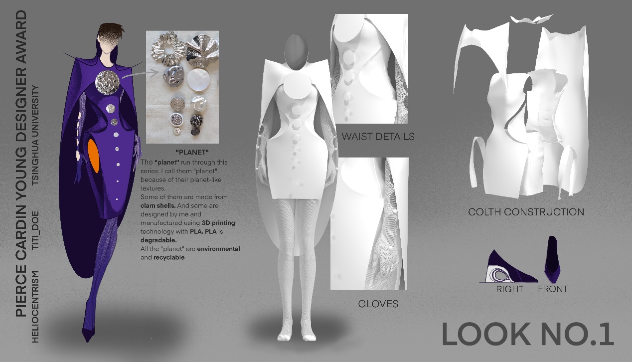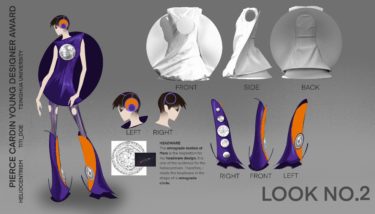Drawing inspiration from the manga Chi: On the Movements of the Earth (a narrative exploring the historical discovery of heliocentrism), Lin Rong’s collection Heliocentrism utilizes circular forms as the primary silhouette catalyst. Merging sustainability with technology, she incorporated eco-friendly materials to create 3D-printed garment accessories. Demonstrating versatility, Lin also developed a digital fashion webpage for Pierre Cardin, bridging the physical and virtual realms.
